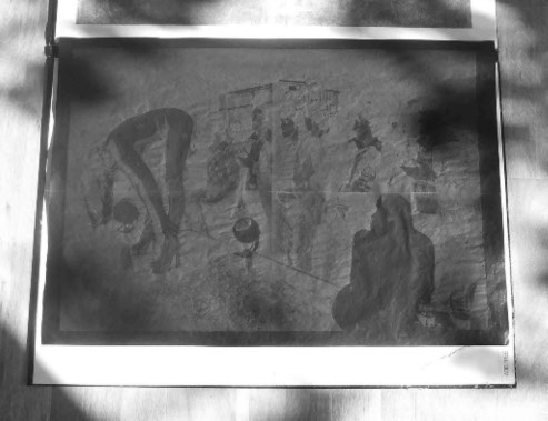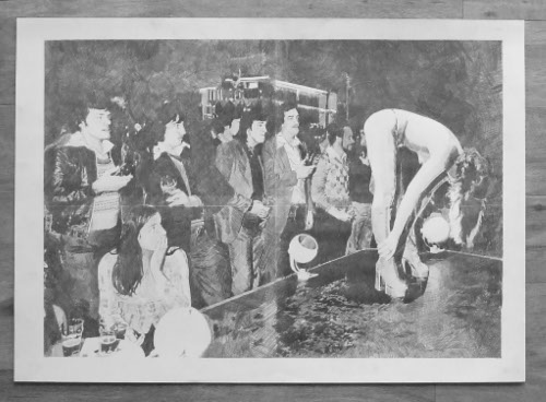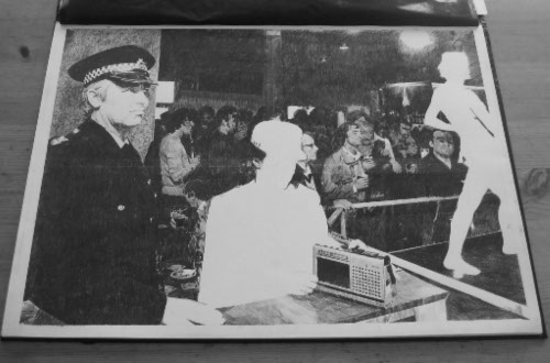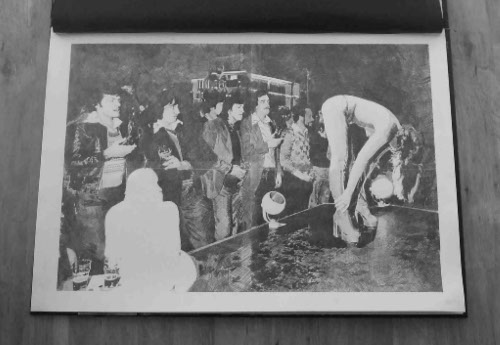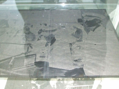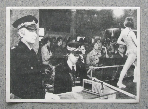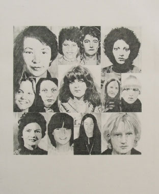 Work which refers to the so-called Yorkshire Ripper killings between 1975 - 1980. The Lie is based on a photograph taken by Don McCullen and shows a performance by a stripper in a Bradford working men’s club in 1978, right at the height of the hunt for the killer. The second image is from an anonymous photograph and shows a policeman and policewoman playing a recording of the hoax tape purporting to be from the killer himself. The third image is a collage of the thirteen women murdered by Peter Sutcliffe.